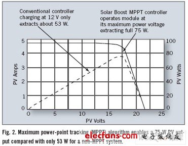 图2说明了典型的75W光伏模块在25℃电池温度下的传统电流/电压特性。虚线表示的是电压(PV VOLTS)与功率(PV WATTS)之比。实线表示的是电压与电流(PV AMPS)之比。如图2所示,在12V时,输出功率大约为53W。换句话说,通过将光伏模块强制工作在12V,输出功率被限制在约53W。