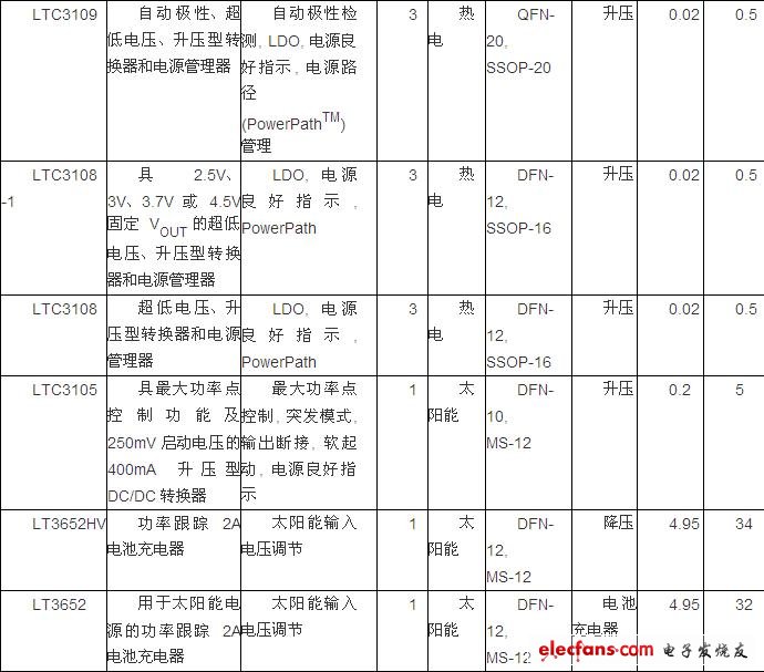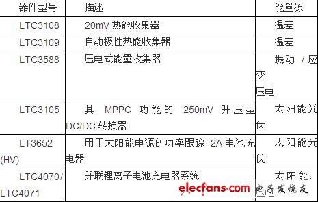 答:在我们周围存在着许许多多的环境能量,能量收集的传统方法一直是借助太阳能电池板和风力发电机。不过,新的收集手段允许我们利用各种各样的环境能量源来产生电能。而且,重要之处不是电路的能量转换效率,而更多地是在于可为其供电的“平均收集”能量值。例如:热电发生器可将热量转换为电力、压电元件可转换机械振动、光伏元件用于转换阳光 (或任何光子源)、而电流转换器则可从湿气实现能量转换。这使得能够给远程传感器供电或对电能存储器件 (例如:电容器或薄膜电池) 进行充电,从而可为微处理器或发送器实施远程供电,而无需使用本地电源。这为凌力尔特的能量收集产品用作解决方案带来了机会。表 2 列举了我们在该领域中所提供的产品: