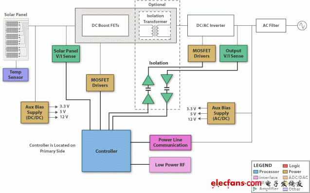 专为在单个时钟周期内读取 ADC 和调整 PWM 而设计的实时处理器非常具有吸引力。简单系统的通讯可由单个处理器进行处理,对于具有复杂的监控报告功能的复杂系统可能需要使用辅助处理器。电流感应通过磁通门传感器或分流电阻器执行。为安全起见,可能需要将处理器与电流和电压及连接外界的通信总线隔离开来。包含集成隔离的 Δ-Σ 调制器非常具有吸引力。可处理较高电压并包含集成感应的 MOSFET/IGBT 驱动器也非常具有吸引力。偏置电源使用 DC-DC 转换器为逆变器上的电子元件提供电源。有时也包含通讯功能,这样用户便可监控转换器、报告功率和工作条件并提供固件更新。通常会使用电力线通信 (PLC) 以减少有线或无线(蓝牙、ZigBee/IEEE802.15.4、6loWPAN)联网选项。