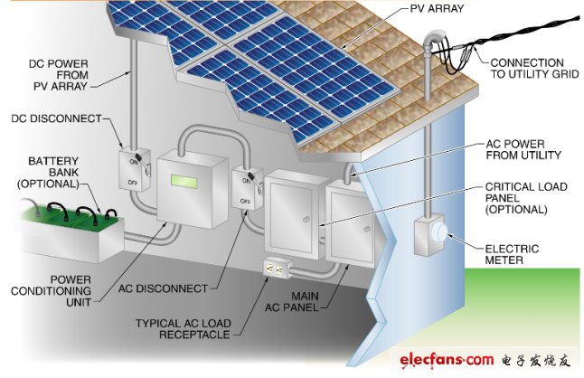 在当今的大部分系统架构中,串联的太阳能面板构成了系统的基本能量采集部分,每块面板产生约30伏的额定直流电压。由于面板处于串联状态,它们的电压会加总起来。一个典型的配置可能有10块面板,每块产生30伏电压,因此总电压为300伏左右。在某些系统中,这个电压被存储到电池里并经过逆变器转换成交流电或直接作为直流电使用。在绝大多数的住宅和太阳能农场配置中均忽略使用电池,而是经逆变器输出交流电并直接连到电网。
