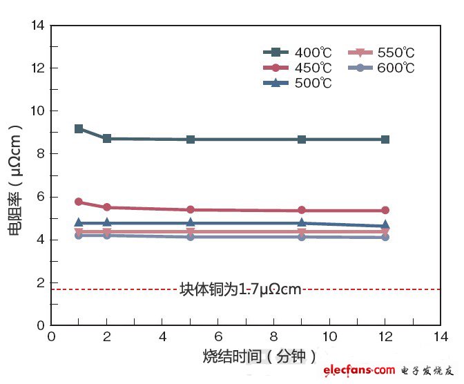 在500℃下烧结1分钟烧结后,铜布线电阻率变为与Ag布线同等或更小的5μΩcm左右。即使延长烧结时间,电阻率也不会上升,因此可在充分防止铜氧化的同时进行烧结(图2)。另外还证实,调整烧结气体的话电阻率还可降至3μΩcm左右。