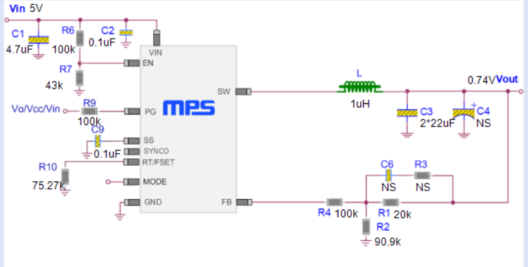 二级BUCK电源电路,DCDC芯片输入5V,输出0.74V,开关频率2.1MHz。工作在FCCM模式。