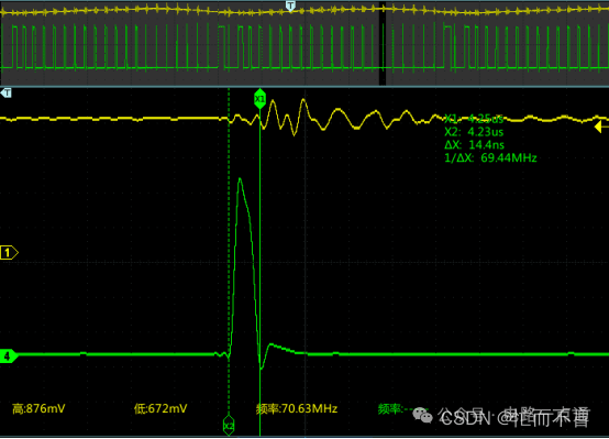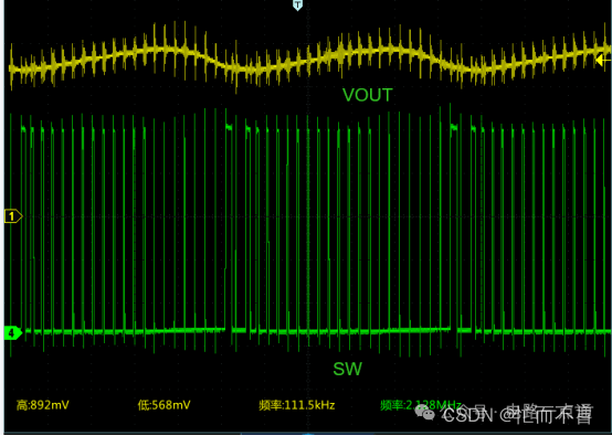 2、如下图,同时测量SW管脚信号和输出信号。其中绿色是DCDC的SW管脚信号,黄色是输出电压(上面的毛刺脉冲是探头串扰,实际波形见上图1) 。可以看出SW信号的脉冲宽度是一直在变化的,从而也导致输出电压不断变化,变化趋势与SW的变化对应。