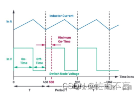 什么是最小导通时间,为什么需要有最小导通时间? 在许多开关模式电源转换器中,电感电流是在导通时间内测量的。此电流用于过流保护,并用于根据电流闭环控制原理(电流模式控制)工作的稳压器中,环路调节也需要测量电感电流。在开关瞬变后,必须先降开关过程中产生的噪音才能进行准确的电流测量。这需要一些时间,也称为消隐时间。而这段时间内内置的电流限制比较器也不会工作,高侧MOS的Gate输出驱动也就不会被关断。