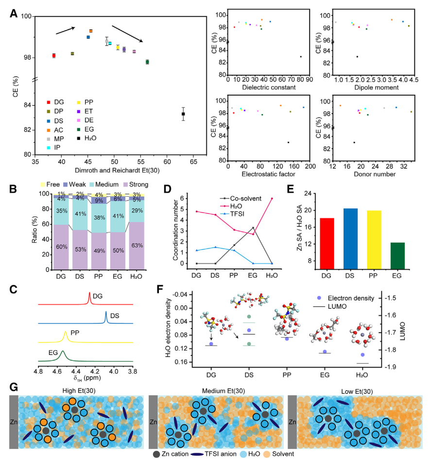 基于此,马里兰大学王春生教授团队提出了一种基于 Et(30) 极性参数 的水系锌电池电解液优化策略,实现了高可逆性Zn电极的构建,并显著提升了电池的循环稳定性。该研究以 “Electrolyte design for aqueous Zn batteries” 为题,发表在《Joule》期刊上。研究团队通过 Et(30) 极性参数精准筛选溶剂,优化Zn²⁺溶剂化结构,有效抑制析氢反应(HER)和Zn枝晶生长,显著提高Zn电极的可逆性。