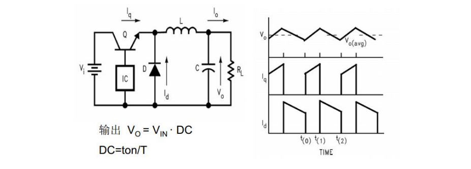 如图,当开关Q导通时,能量从Q的发射极即输入端向输出端传递,电流以斜线形式增大,类似于模型中水库的水传递到小水池。当发现小水池的水位过高时,开关Q便会断开,这时电感L、负载Rl和二极管D形成自然的续流回路,电流开始线性下降。当发现小水池的水位降低到一定程度的时侯,开关Q重新导通。开关Q通过这种高频的开通和关断操作,开关电源便形成了一个稳定的输出电压。
