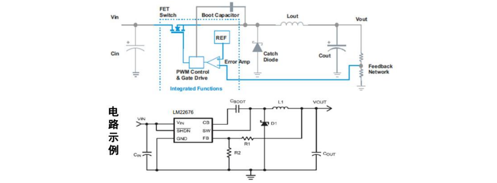 下面的图便是一个工作中常用的降压芯片,型号为LM22676,它的宽输入电压范围:4.5V 至 42V,可以稳定的输出5V3A供负载使用。此芯片中FB引脚便是一个采样反馈引脚,SW便是输出控制引脚,以此来达到一个动态平衡的输出。大家会疑问这个电路中,D1使用的是一个快恢复或者肖特基二极管。为什么要使用这种肖特基二极管呢?因为普通的二极管的寄生参数和漏感原因,会导致在SW发信号,芯片内部MOS管将要开通时产生一个高压震荡,这个震荡极有可能会导致芯片的SW引脚遭受高压损坏,而且开关损耗也会非常大,导致效率非常低。因此,我们通常会使用快恢复或肖特基二极管来应对这些问题。