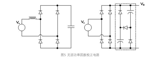 图5右侧为无源功率因数校正电路中的一种,其元件包括电容和二极管;当电路稳定后,由于整流二极管的导通时间得到了延长,所以输入电流谐波也会得到有效的改善。