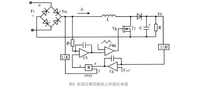 图6给出了一种有源功率因数校正的简化电路,采用双环控制;其中,外环对输出电压进行控制,内环对电感电流进行控制;采取合适的控制策略可以保证电感的峰值电流跟踪上VDC的变化,从而实现具有正弦波形式的平均电流。