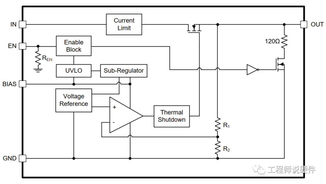 我们再详细研究一下NMOS管LDO的内部框图,其主要也是由MOS管、分压电阻、参考电压电路、误差放大器构成的一个负反馈回路。仔细观察会发现其比PMOS LDO多一个BIAS pin,这是因为NMOS管的导通需要Vgs电压大于0,因此BIAS的电压就需要比Vout电压高,规格书中都会有明确标注。