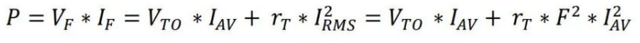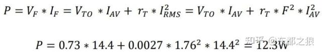 在公式中,电流的量化涉及到二极管上的电流平均值IAV和电流有效值IRMS。在二极管上流过的是直流电流,我们计算的是直流下的平均功耗(功率),所以功耗(功率)第一个部分是直流电压平均值与直流平均电流的积,这里需要知道流过二极管的平均电流;而电阻性的损耗(功率)是电流有效值的平方与电阻值的积,这里需要知道流过二极管电流有效值。
