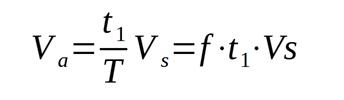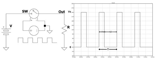 若SW开关闭合时间t1,则负载R两端有电压Vs。相反,如果该开关打开时间 t2,则负载 R 两端的电压为 0 V。这些脉冲的快速连续导致负载处的电压介于 0 V 和 Vs 之间。后者可作为占空比的函数在 0% 和 100% (PWM) 之间变化。如果信号由矩形波或方波生成,则该电压等于: