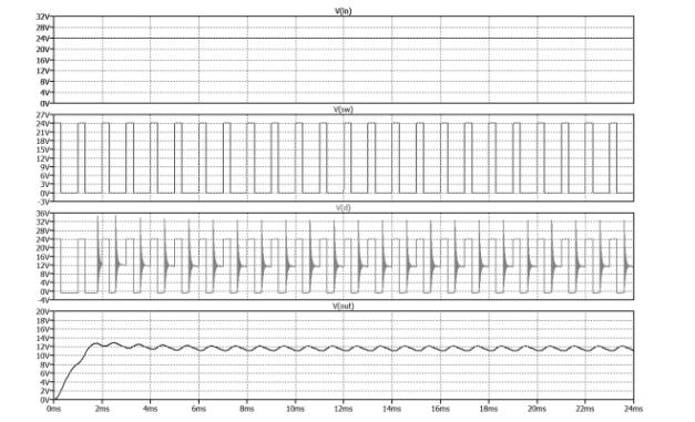 v(d): 是二极管两端的信号。可以看出,它受到峰值和振荡的影响,使信号因干扰(EMI)而饱和;
