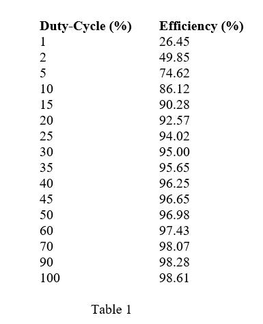 下表显示了开关的一些占空比值以及相应的系统效率值。当然,这是通用数据,可能会根据许多电路参数而略有不同。