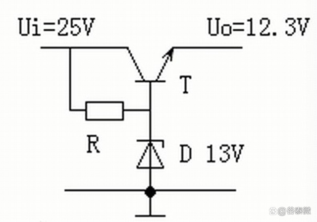 在此电路中,三极管 T 的基极被稳压二极管 D 稳定在 13V,那么其发射极就输出恒定的 13-0.7=12.3V 电压了,在一定范围内,无论输入电压升高还是降低,无论负载电阻大小变化,输出电压都保持不变,这个电路在很多场合下都有应用。