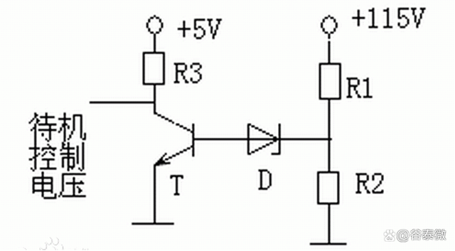 115V 是电视机主供电电压,当电源输出电压过高时,D 导通,三极管 T 导通,其集电极电位将由原来的高电平(5V)变为低电平,通过待机控制线的电压使电视机进入待机保护状态。