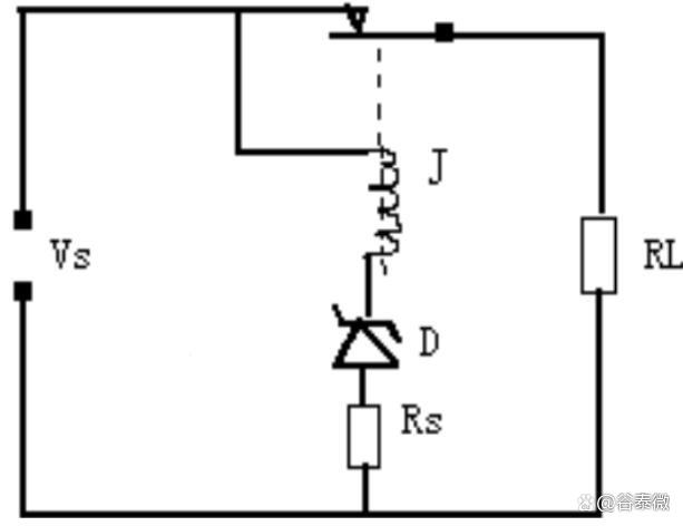 稳压管在准确的电压下击穿,这就使得它可作为限制或保护之元件来使用,因为各种电压的稳压二极管都可以得到,故对于这种应用特别适宜。图中的稳压二极管 D 是作为过压保护器件。只要电源电压 VS 超过二极管的稳压值 D 就导通,使继电器 J 吸合负载 RL 就与电源分开。