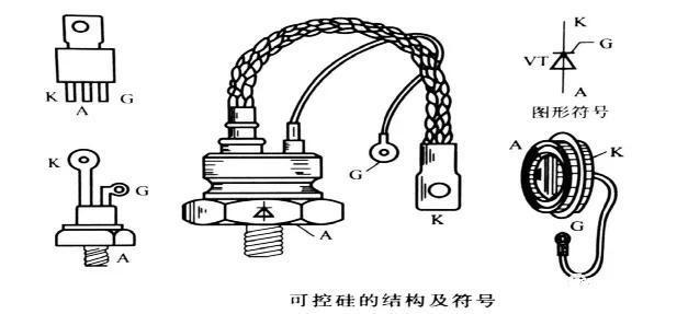 1、 可控硅的结构及符号如上图所示,它有阳极A、阴极K和门极G三个电极。螺栓式可控硅的阳极紧拴在铝制散热器上,平板式可控硅则用两个彼此绝缘、形状相同的散热器把阳极与阴极紧紧夹住。