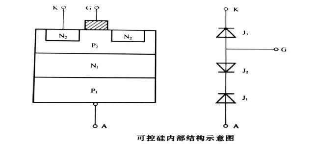 2、 可控硅的内部结构如上图所示,它的管芯由四层(P1、N1、P2、N2)、三端(A、K、G)半导体器件构成,具有3个PN结,即J1、J2、J3,由此可见,可控硅是一个四层三端三结大功率半导体器件。