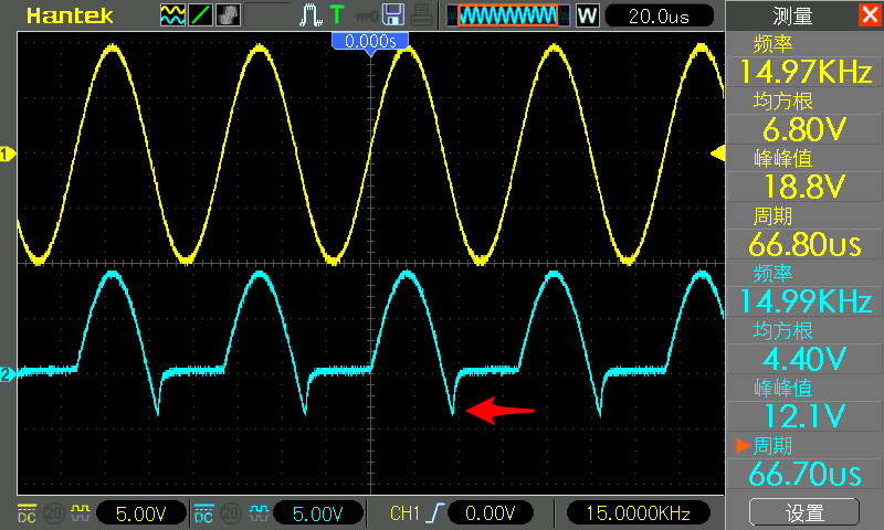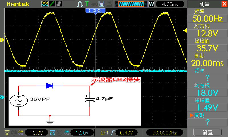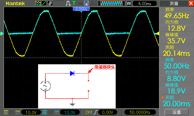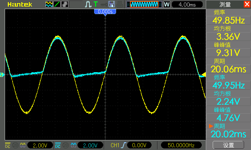 CH1 探头还是接在二极管正极,CH2 探头还是接在二极管负极,下图中 CH1 为黄色,CH2 为青色。