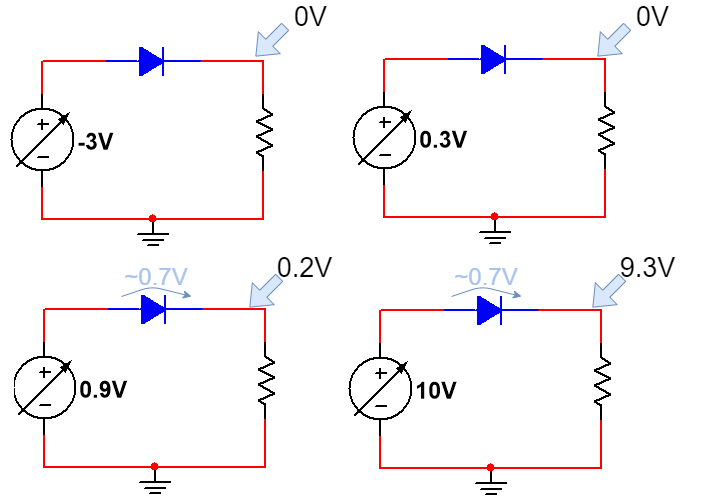 当输入电压为 0.9 伏时,二极管导通,但由于正向压降,在输出端电压为 0.2 伏。