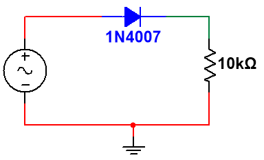 因此,如果你给二极管正极输入交流电,负电压将被阻止,在二极管的负极端将会只得到波形的正半部分。这个过程被称为半波整流(Half Wave Rectification)。它也适用于其他带有负电压的波形,比如:方波、三角波等。
