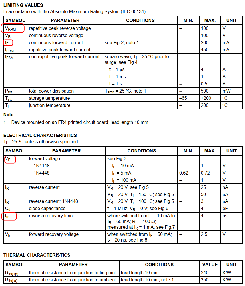 二极管最后一个值得注意的参数就是:开关速度(switching speed)。文档中这个参数一般在电器参数(ELECTRICAL CHARACTERISTICS )中,写为反向恢复时间(Reverse Recovery Time),符号为:trr。