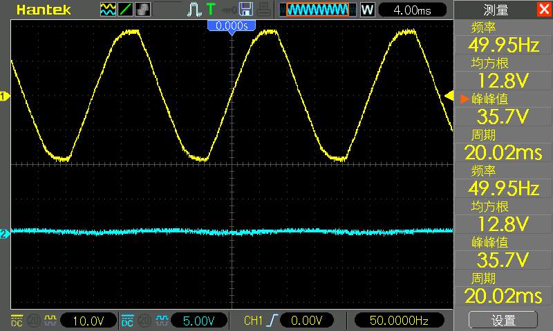 负载为零时,变压器输出一个干净的正弦波,峰峰值约为 36 伏,频率为 50 赫兹。