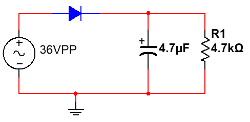 我们在二极管后加一个 4.7 微法的电容,立马输出一个完美的电压为 18 伏直流电: