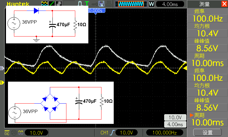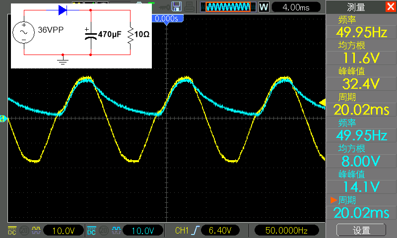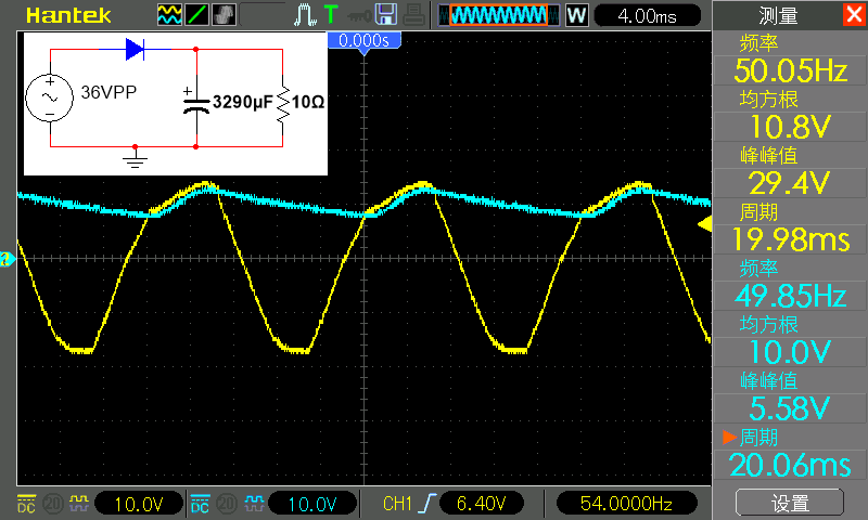 从下面的波形中,可以看到之前 50 赫兹的有正有负的电压,经过整流后变为没有负电压的 100 赫兹的恒为正的驼峰型电压。这被称为全波整流,因为我们正在对全交流波进行整流。白色的波形是输入波形,是使用示波器的参考波形功能保存好并调出显示的。因为此时交流和直流没有共同的接地,因此无法同时测量这两个波形。整流后的波形的峰峰值为 16.3 伏,均方根值为 11.2 伏。