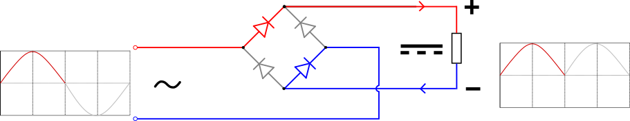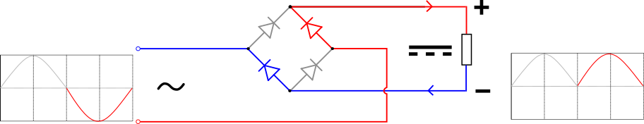 现在在正弦波的后半部分,连到菱形左边的输入为负(蓝),连到菱形右边的输入为正(红),电流从下方的端子沿着红色(正)路径往右流到输出,返回时沿着蓝色(负)路径回到下方的电源端子。