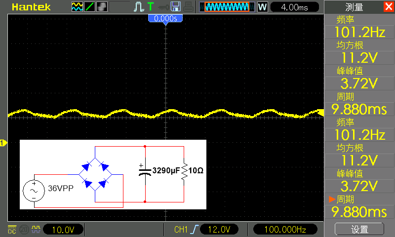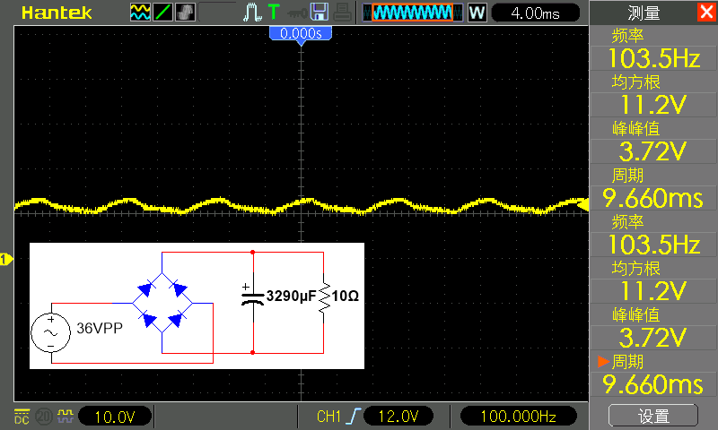 均方根值(可以理解为平均值)到了 11.2 伏的电压高于之前使用的 470 微法滤波的 10 伏,电源纹波也由 8.5 伏降低到了 3.72 伏。