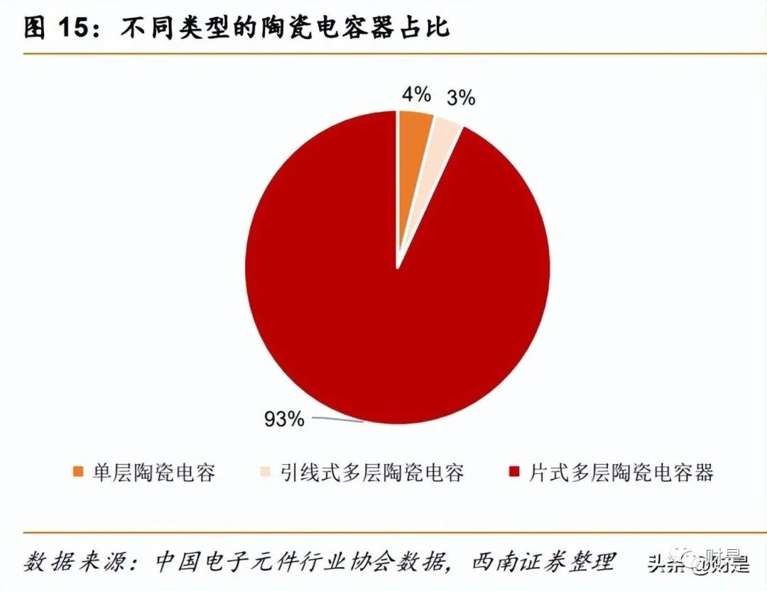 电容器根据介质材料的不同可分为陶瓷电容器、铝电解电容器、钽电解电容器、薄膜电容器等。根据中国电子元器件协会数据(2019年),电容器市场中陶瓷电容器份额最大,约达43%。陶瓷电容器根据结构的不同又可分为单层陶瓷电容、引线式多层陶瓷电容、片式多层陶瓷电容器三大类;根据中国电子元器件协会数据(2019年),片式多层陶瓷电容器(MLCC)占据93%的市场份额。