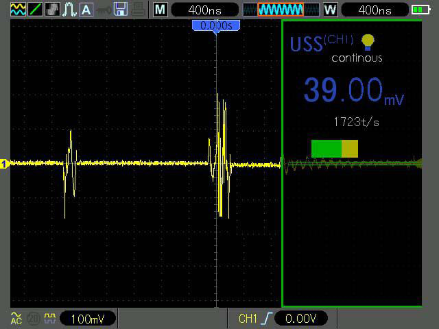 单击后主机处于自动触发状态,显示界面通道1则显示为当前超声波传感器检测到的放电信号。
