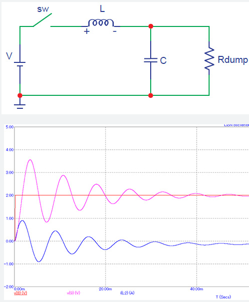 一旦电路中连接了耗散元件(电阻“Rdump”),扼流圈和电容器之间的能量传输就会有损耗,振荡幅度也会随时间减小。