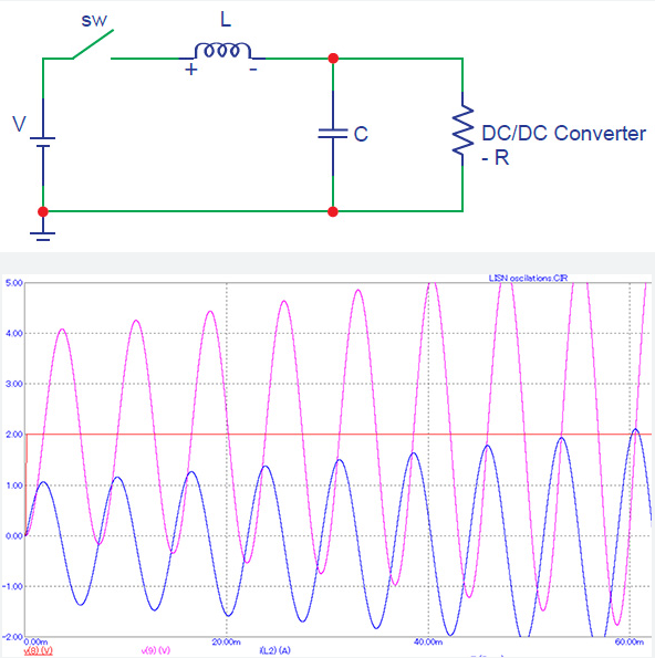 该问题与CDN内部存在电感有关,该电感用于将直流电源与DC/DC转换器解耦,并组合了转换器的电容。CDN中使用的电感越高,预期的振荡概率就越高。相反,转换器的输入电容越高,振荡的可能性就越小。