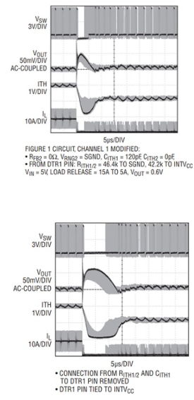 图图4.瞬态检测通过检测瞬态(DTR)引脚完成,该引脚的直流偏置略高于1/2 INTVCC,并通过补偿电容CITH1交流耦合到ITH引脚。等效补偿电阻 RITH = RITH1 ||RITH2.