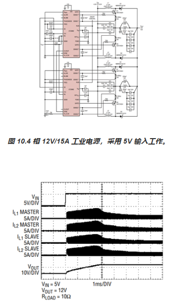 图 10 说明了一个工业 转换 5V 输入的电源 至 12V 输出,电流高达 15A 负载电流。使用四个阶段 大大简化了选择的任务 功率组件,并减少 输出纹波显著。图11显示了此电路的启动波形 转炉。图 12 显示了负载 步进波形。
