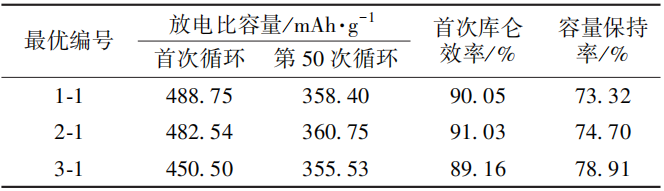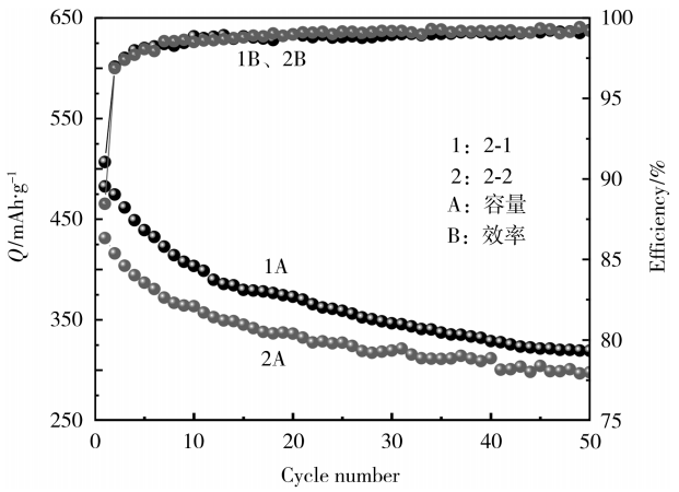 从图2可知,随着FEC添加量的增加,电池的首次库仑效率和放电比容量明显降低。2-1电池的首次放电比容量为482.54mAh/g,首次循环库仑效率为91.03%;而2-2电池的首次放电比容量低于450.00mAh/g,首次循环效率低于90.00%,此时电池性能不稳定且明显下降,与1-1、2-1电池相差甚远,原因是形成的SEI膜过于致密,损耗过量Li+,且剩余的Li+无法自由通过SEI膜进行嵌脱,导致比容量下降,首次库仑效率下降。由此可知,FEC添加量不宜超过3%。