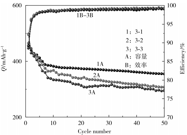 从图3可知,随着VC添加量的增加,电池的放电比容量下降,且越来越不稳定。3-1、3-2和3-3电池的首次库仑效率分别为89.2%、92.15%和88.55%。3-1电池的首次放电比容量及首次库仑效率虽然均比3-2、3-3电池低,但是从循环50次的结果来看,循环稳定性较好;3-3电池的比容量经过7~8次循环即出现较大波动,循环性能不稳定;而3-2电池也在32次循环后出现波动。虽然VC添加量为2%时的电池首次库仑效率较高,但综合而言,VC添加量为1%时的电池综合性能较好,内阻较低、容量保持率较高。