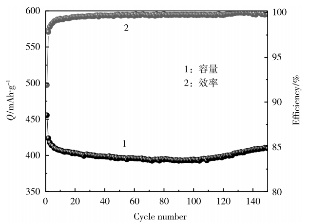 从图4可知,改进后电池的首次库仑效率达到91.90%。经过4次循环,库仑效率已接近100%。负极材料的首次放电比容量为452.60mAh/g,虽低于1-1、2-1电池,但经过150次循环后,比容量保持较为平稳;后期略有升高,可能是因为半电池Si-C负极涂覆较厚,在前期的充放电过程中未能充分地嵌脱锂,经过几十次循环后才能深入地嵌脱锂,Li+在进入硅晶格的过程中,导致硅颗粒粉化为原子态,且随着循环次数增加而增多,比表面积增加,故在后期循环中整体容量会升高。电池的整体的容量保持率能达到86.50%。