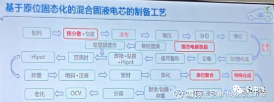 半固态电池仍需要电解液,其制造工艺和液态电池相差不大。不同的地方在于混浆,以及负极预锂化,原位固态化(将部分电解液转化为固态电解质)几个环节。