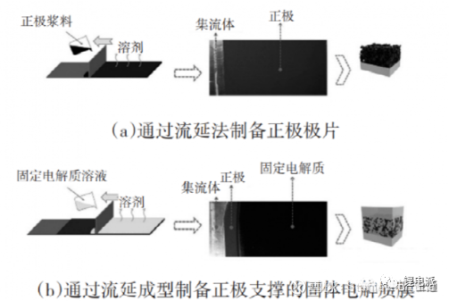 4.2.1. 成膜工艺 固体电解质的成膜工艺是全固态电池制造的核心。不同的工艺会影响固体电解质膜的厚度和离子电导率,固体电解质膜过厚会降低全固态电池的质量能量密度和体积能量密度,同时也会提高电池的内阻;固体电解质膜过薄机械性能会变差,有可能引起短路。 成膜工艺可分为湿法工艺、干法工艺和气相沉积工艺三种。 湿法工艺操作简单,工艺成熟,易于规模化生产,但成本高,且采用的溶剂可能具有毒性,残留的溶剂会降低固体电解质膜的离子电导率。按照载体不同,湿法工艺可分为模具支撑成膜、正极支撑成膜以及骨架支撑成膜。模具支撑成膜常被用于制备聚合物电解质膜及复合电解质膜,将固体电解质溶液倾倒在模具上,随后蒸发溶剂,从而获得固体电解质膜,通过调节溶液的体积和浓度来控制膜的厚度。正极支撑成膜常用于无机电解质膜及复合电解质膜的制备,将固体电解质溶液直接浇在正极表面,蒸发掉溶剂后,在正极表面形成固体电解质膜。与模具支撑相比,正极支撑可以获得更薄的固体电解质膜和更好的界面接触。骨架支撑成膜常用于复合电解质膜的制备,将固体电解质溶液注入骨架中,蒸发掉溶剂后,形成具有骨架支撑的固体电解质膜。