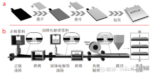 分段叠片(图a)沿用液态电池叠片工艺,将正极、固体电解质层和负极裁切成指定尺寸后按顺序依次叠片后进行包装; 一体化叠片(图b)是在裁切前将正极,固体电解质膜和负极压延成3层结构,按尺寸需求将该3层结构裁切成多个“正极-固体电解质膜-负极”单元,并将其堆叠在一起后进行包装。 图:固态电池叠片工艺