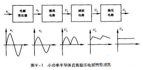 常用的小功率半导体直流稳压电源系统由电源变压器、整流电路、滤波电路和稳压电路四部分组成,如图9—1所示为其原理框图和各部分输出波形。