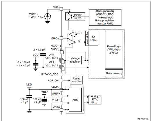 学习STM32F407的电源供电,往往被一堆电源标识Vdd,Vdda,Vcap,Vss等搞迷糊,这些标识整明白了,电源供电部分也就理解了,首先看下面的框图:
