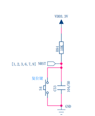 R84和C53组成简单的RC复位电路。当系统上电瞬间,C114电容两端电压可以认为是0,CPU处于复位状态。3.3V电源通过R84给C53充电,当C53的电压升到CPU的高电平门槛电压时,CPU退出复位状态转入运行状态。