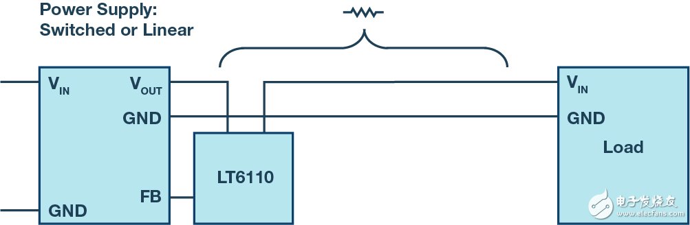 采用 LT6110 这类元件,就可以根据相应的负载电流来调节电源电压;不过,进行这种调节需要了解线路电阻相关信息。大多数应用都会提供此信息。如果在器件的使用寿命期间,将连接线更换成更长或更短的连接线,则还必须对采用 LT6110 实现的电压补偿进行相应调整。
