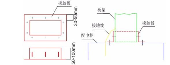 二、配电柜安装完成后,安装柜上方的的桥架。配电柜进出电缆开孔位置由供货方按尺寸预留。电缆敷设完成后封闭。桥架与柜内接地母排用专用接地线可靠接地。桥架与配电箱(柜)连接处采用橡胶板连接,以保护导线和电缆,桥架与配电柜连接见图。