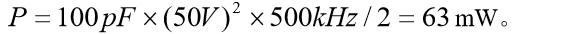 可以开看到,当晶体管导通时,电容能量消耗在 MOSFET中。如果电容足够小,这可能不太坏。例如,如果电容是 100pF,输入电压是 50V,开关频率是 500kHz,仅由于电容引起的损耗为
